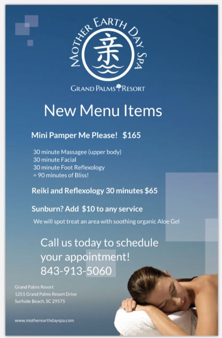 Welcome to my Mother Earth Day Spa at Grand Palms Resort formerly named Plantation Resort! We are located at a resort in Surfside Beach, South Carolina, just south of Myrtle Beach. If you’re looking for a professional massage therapist, you’ve come to the right place.